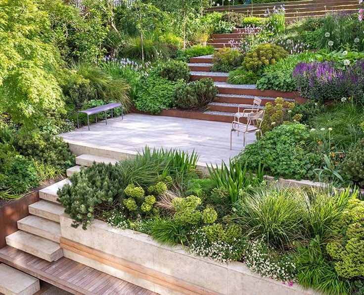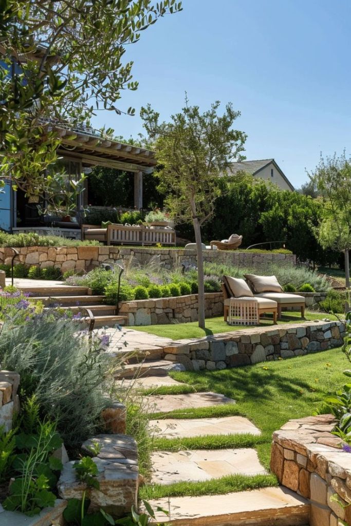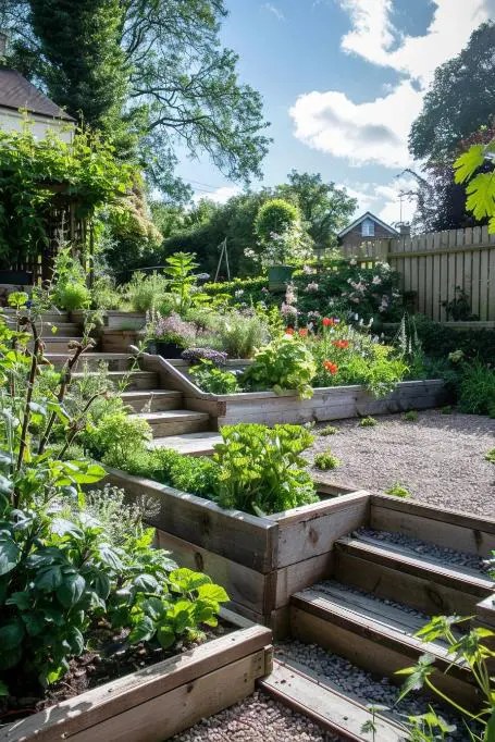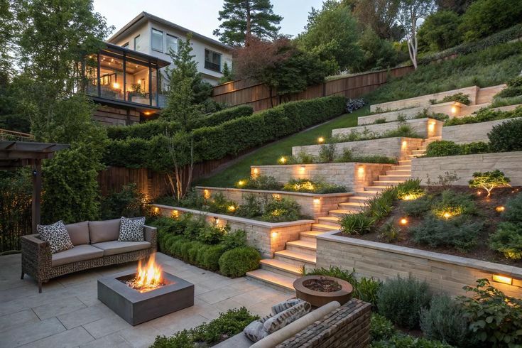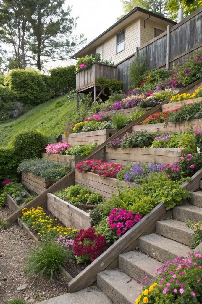 Breaking the slope into multiple mini-terraces helps create usable zones — think garden rooms, play corners, or herb beds.