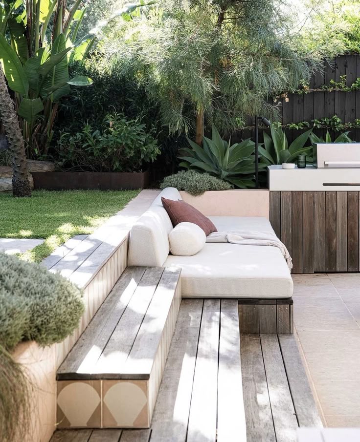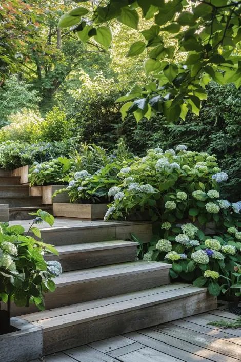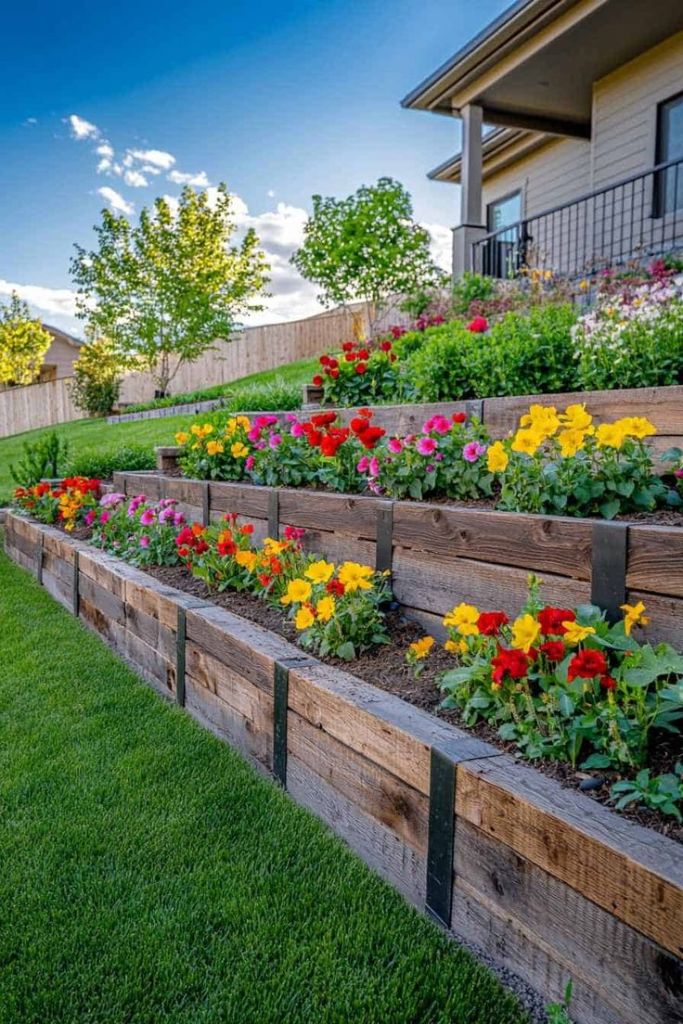 Wooden retaining walls give a warm, organic vibe.