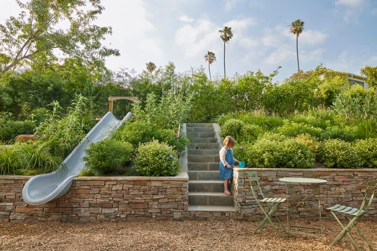Let’s be honest- kids love a slope! Use it to your advantage with play features that blend into your garden’s aesthetic.