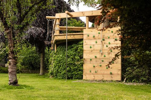 Play zone terrace filled with woodchips, a slide, or sandbox.