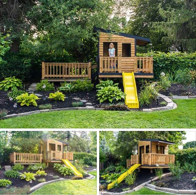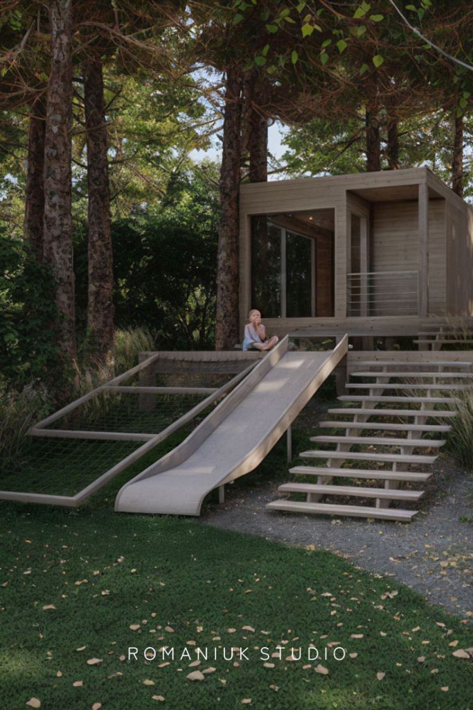 Built-in slides down the hill: minimal, safe, and super fun.