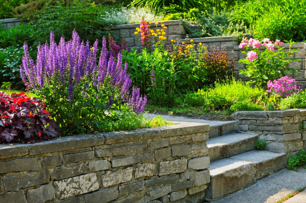 Tiered planters that follow the terrain.
