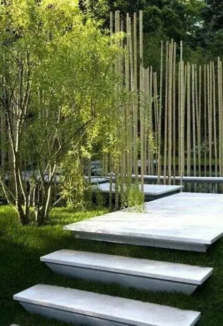 Modern stone steps lined with tall grasses create a spa-like feel.